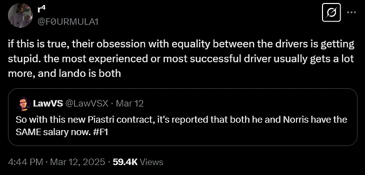 «Так что с этим новым контрактом Пиастри, сообщается, что теперь оба: он и Норрис будут иметь ОДИНАКОВУЮ зарплату».