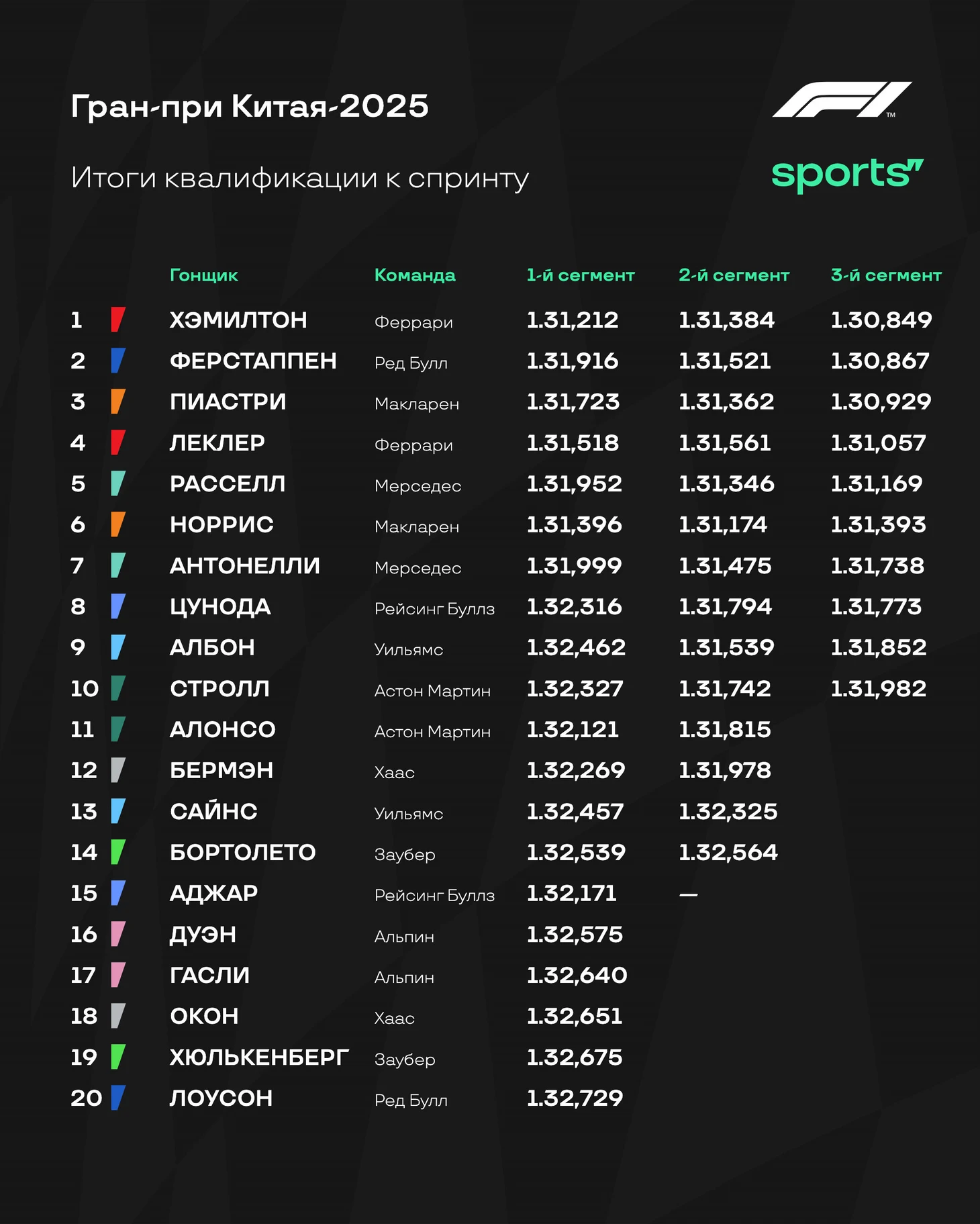 Макс Ферстаппен в последние годы особенно прославился как гений адаптации к любой машине и условиям, потому его претензии на быстрейшие круги при безошибочном пилотаже всегда самые опасные. Но внезапно выстрелил и 40-летний Льюис Хэмилтон – хоть подстройка под «Феррари» далеко не закончена, семикратный чемпион все-таки самый успешный на треке в Шанхае (6 побед с поулами и 9 подиумов), а трасса подходит ему по пилотажному стилю. А поскольку из-за спринтерского уик-энда все оказались в примерно равных условиях (необходимость быстро привыкать к полностью новым обстоятельствам), Хэмилтон напомнил и о таланте, и о преимуществах огромного опыта.