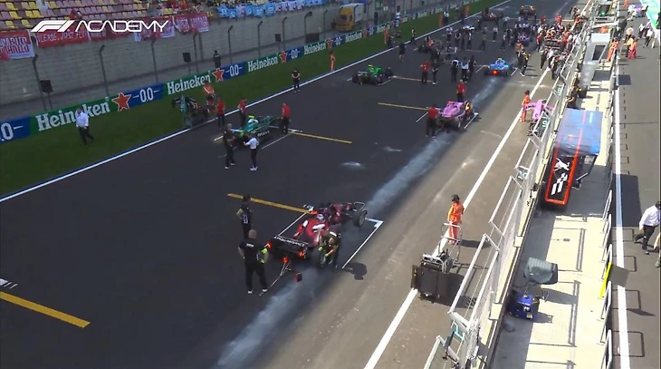 Также перед стартом выяснилось, что на четной стороне решетки (позиции 2-4-6…) разлилось масло после отказа мотора в машине во время гонки поддержки класса GT. Затем зону нейтрализовывали покрытие специальным составом. В таких случаях сильно снижается сцепление, и вся цепочка стартующих здорово страдает – потому, например, в женской «Академии «Ф-1» гонщицам выписали дополнительный прогревочный круг и начало заезда с ходу (по гоночной «нечетной» траектории) вместо старта с места для уравнивания шансов..