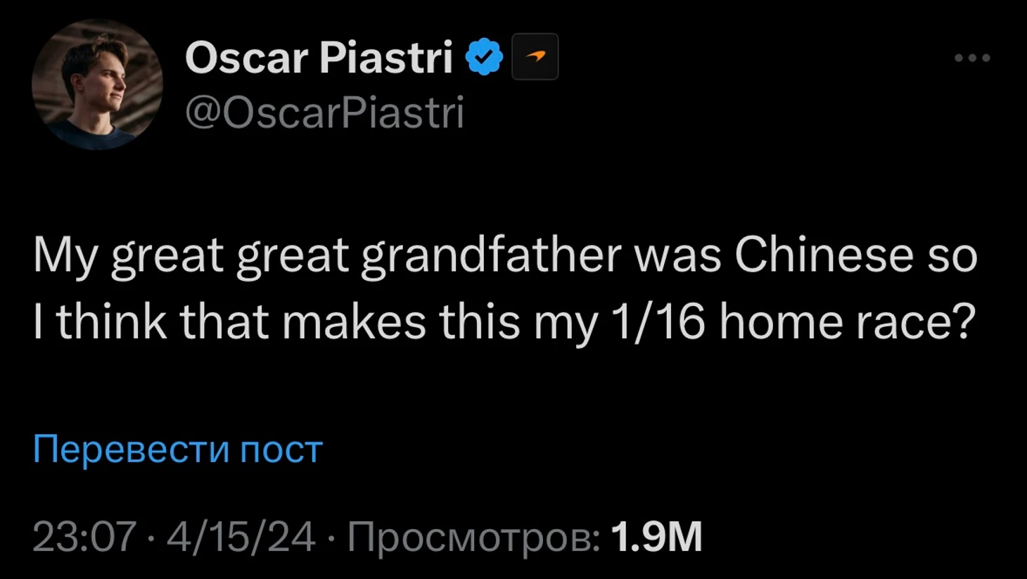 На самом деле, Оскар шутил об этом еще перед прошлогодним этапом: «Мой пра-пра-прадедушка был китайцем, так что, я так полагаю, это делает [Гран-при Китая] на 1/16 моей домашней гонкой?».
