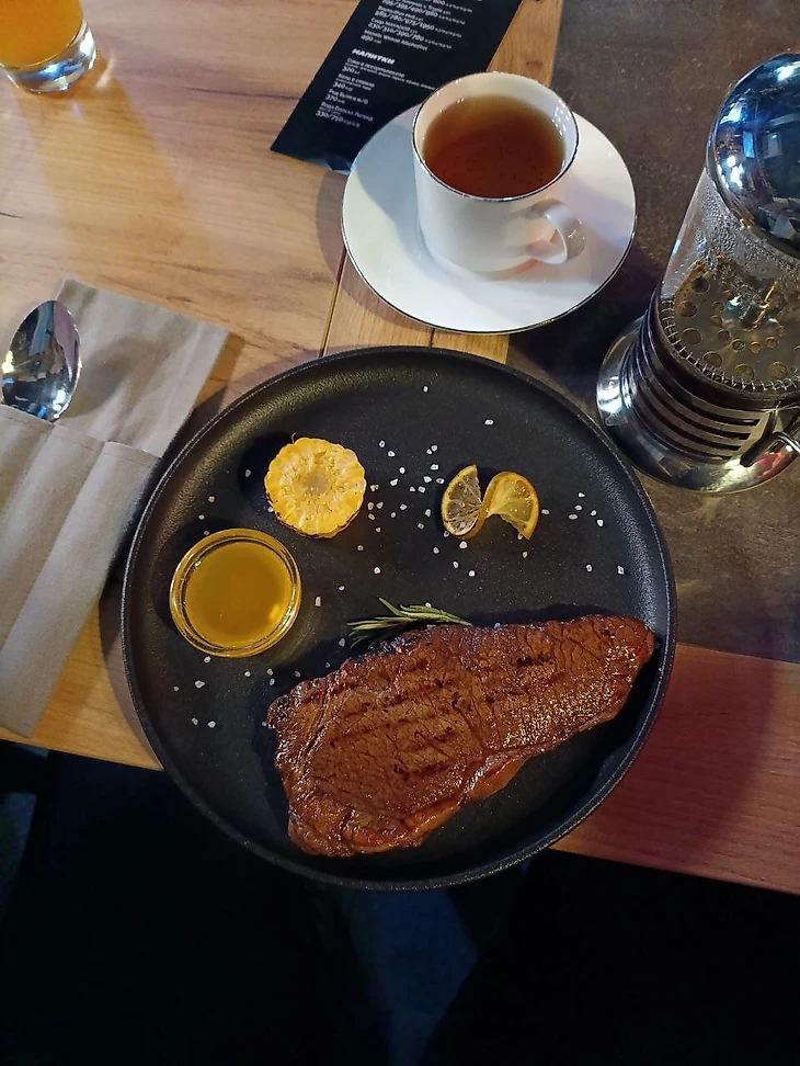 Мне нужно было отбить депозит и наесть на 3000. Поэтому в дело, конечно, пошел стейк – повара немного не попали в прожарку (сделали rare вместо medium rare), а еще дали слишком много соли.