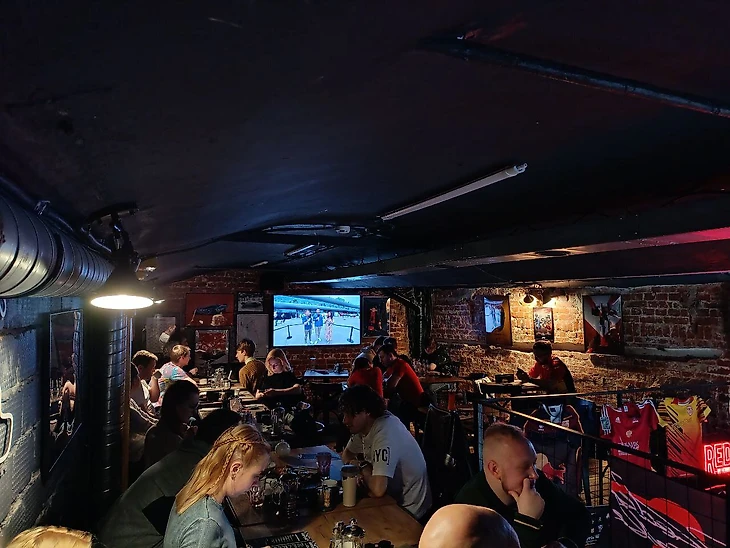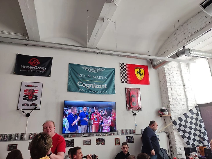 После бронирования менеджер посоветовала: «Приходите пораньше, за 40 минут или час». Я пришел в 9:30 (гонка начиналась в 10), и бар уже был практически забит. И быстро стало понятно, что собрались фанаты гонок и машин. Глянул в одну сторону – увидел мужчину в футболке «Мерседеса». Посмотрел в другую – увидел мерч «Макларена». Присмотрелся к соседу за столиком – оценил часы «Феррари».