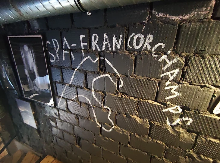 В «Гаснут огни» много атрибутов обычного бара. Например, знак про то, что пиво помогает уродливым людям заниматься сексом с 1862-го. Или разнузданные картины в туалетах. С надписями, которые мы, как СМИ, вынуждены замазывать.