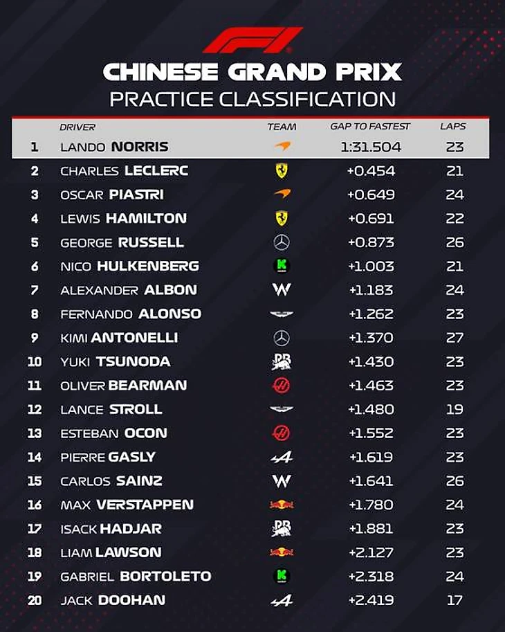 🏎️ В пятницу прошла первая и единственная практика Гран-При Китая. Вот её результаты: