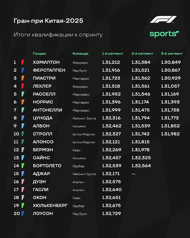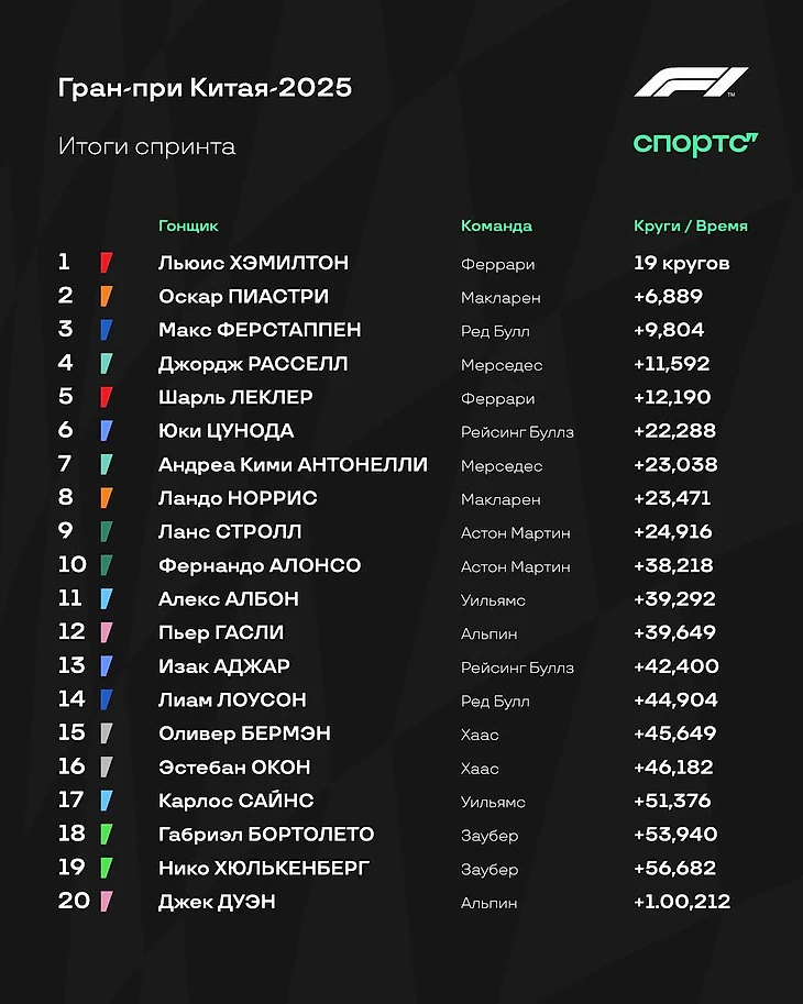 🏎️ Прошёл первый из шести спринтов этого года. Победу одержал - Льюис Хэмилтон. Вот полные итоги: