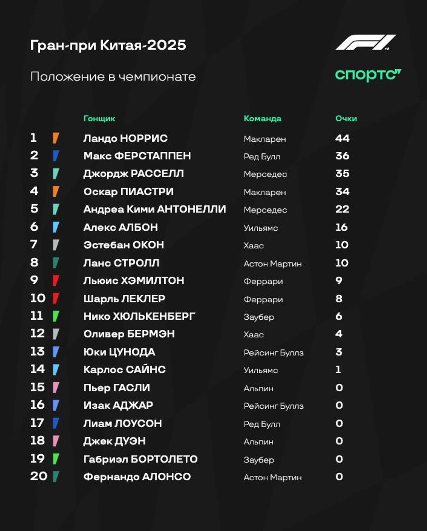 📋 Ситуация в личном зачёте пилотов после Гран-При Китая: