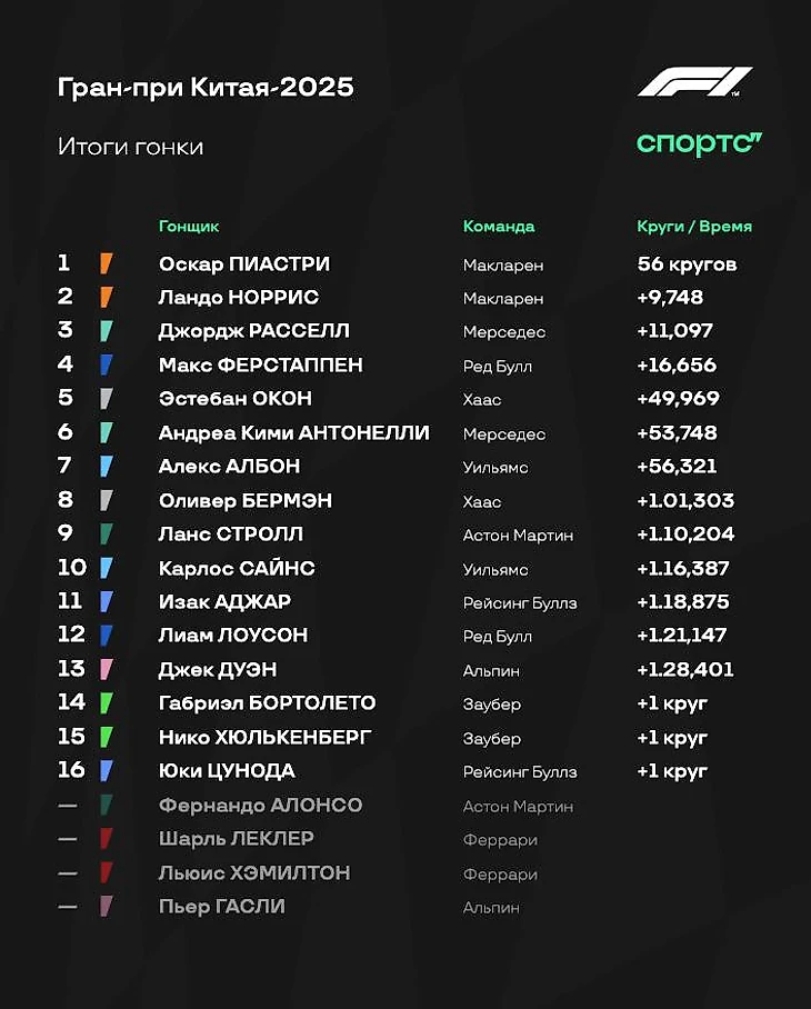 🏎️ Вот и закончился Гран-При Китая. Победу одержал - Оскар Пиастри. Дубль для Макларена и второй подиум у Рассела в сезоне. Феррари только на 5 и 6. Обе Феррари и Пьер Гасли были дисквалифицированы из общего протокола Гран-При Китая. Леклер и Гасли за недовес. Хэмилтон за чересчур стёртую планку. После дисквалификаций результат гонки стал таким: