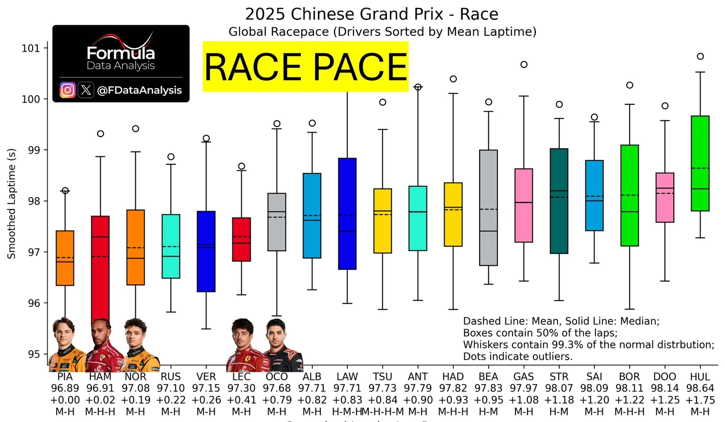 (закрашенный прямоугольник – распределение времени 50% всех кругов пилота, тем ниже – тем время быстрее, прерывистая линия на нем – средний темп, сплошная – медианный темп)
