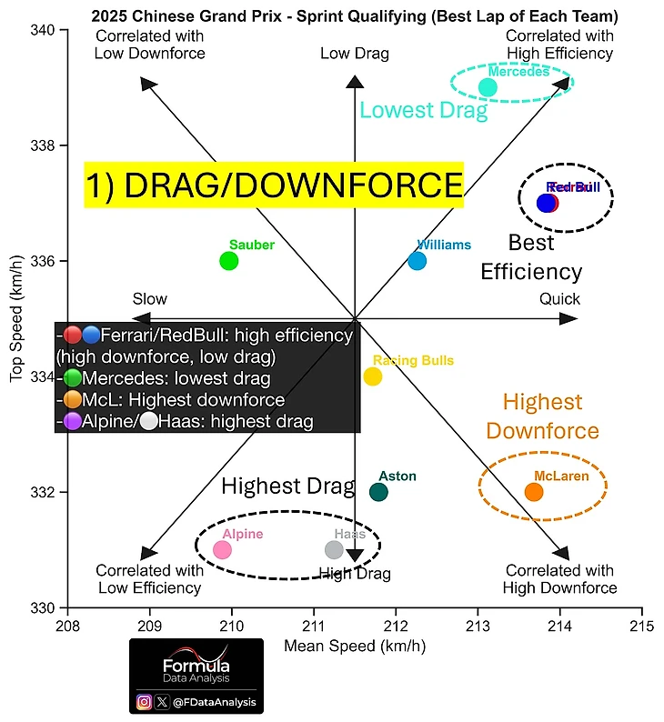 Тот же график эффективности шасси вскрывает и потенциал болида «Ред Булл»: у RB21 отличные прижимная сила и средняя скорость, причем без штрафа в виде лобового сопротивления и скорости на прямых.