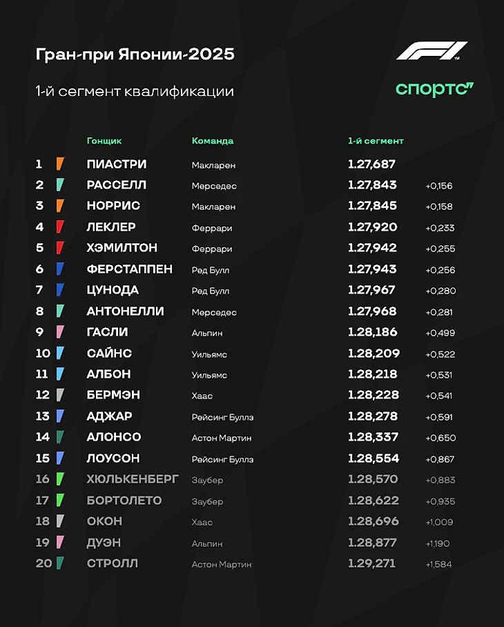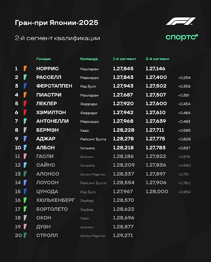 Весьма неожиданные результаты второго сегмента. Из борьбы выбыли: Гасли, Сайнс, Алонсо, Лоусон и Цунода! Зато Бермэн и Аджар вывезли «Хаас» и «Рейсинг Буллз» соответственно в финальный сегмент!
