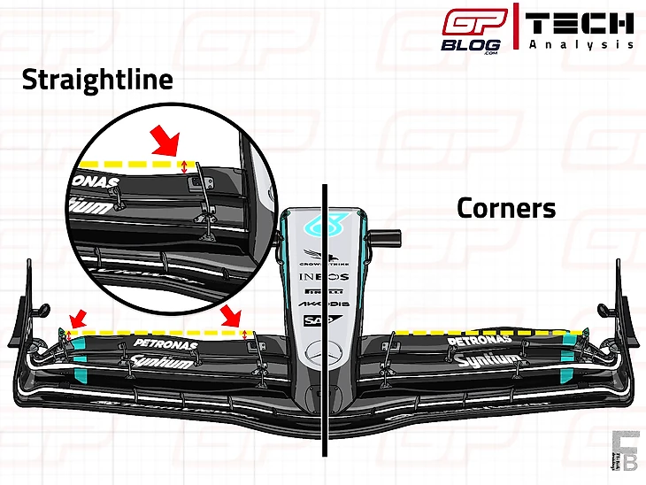 Когда болид разгоняется до 250-260 км/ч, плоскости крыла прогибаются. Так уменьшается сопротивление, образуется нечто вроде DRS. Это также помогает в скоростных поворотах, где у «Мерседеса» наблюдается преимущество.