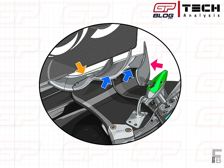 Эта конструкция за счет двух каналов (синие стрелки) «вымывает» потоки воздуха, уводит их от передних шин и тем самым уменьшает сопротивление. Важно то, что это работает одновременно с гибким крылом – то есть «Мерседес» нашел способ еще сильнее увеличить положительный эффект.