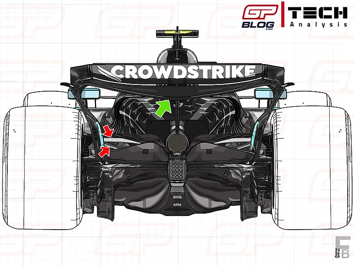 Не забыли и про заднюю ось: в Бракли значительно доработали подвеску (красные стрелки), благодаря чему W16 обрел отличное сцепление – особенно в медленных поворотах. Теперь у «Мерседеса» стабильная задняя часть, которую можно излишне не перегружать (зеленые стрелки).