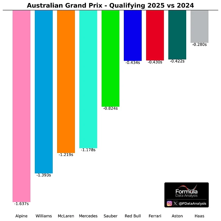 Помог стабильный и уверенный пилотаж Джорджа Расселла, который взял на себя роль лидера команды после ухода Льюиса Хэмилтона. Но не менее важным оказался мощный прогресс в темпе. Просто посмотрите, насколько «Мерседес» улучшил время в квалификации в Мельбурне по сравнению с прошлым годом – W16 сделал большой шаг вперед (явно больше, чем «Феррари» и «Ред Булл»):