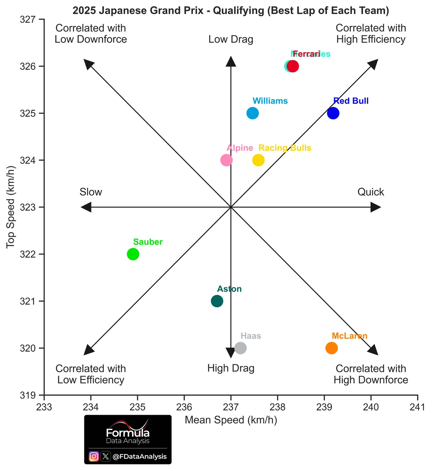 Больше всего потенциала «под дождь» обнаружилось у «Макларена» и «Хааса» с точки зрения прижимной силы (рассчитывается по соотношению максимальной скорости (ось вверх) и средней (ось влево), правее и выше машины с высокоэффективным шасси, левее и ниже – болиды с большим аэродинамическим сопротивлением). А рисковали больше всех «Мерседес», «Уильямс» и «Альпин».