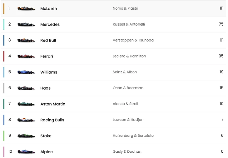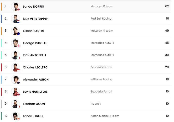 Шарль Леклер из «Феррари» финишировал четвертым. Команда «Мерседес» также показала неплохой результат: Джордж Расселл стал пятым, а его напарник, новичок Кими Антонелли, – шестым. Антонелли даже ненадолго возглавил гонку во время пит-стопов, что стало значительным достижением, сделав его самым молодым гонщиком, лидировавшим в гонке «Формулы-1». Льюис Хэмилтон, второй пилот «Феррари», завершил гонку на седьмом месте.