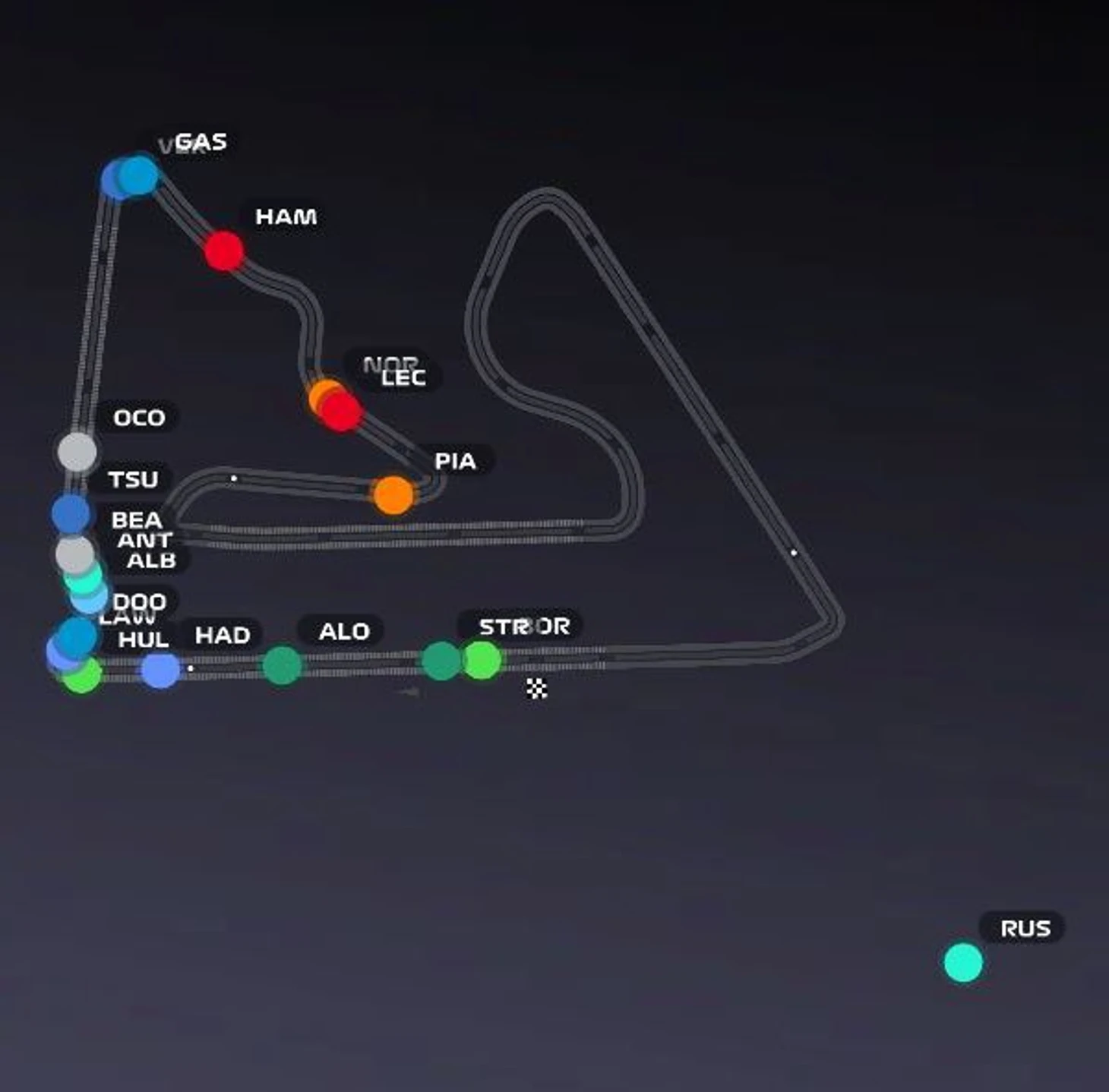 На последних кругах (когда «Феррари» осталась позади) Ландо удерживал более быстрый темп и активно прессинговал дезориентированного Расселла. На последнем круге №4 едва не прошел соотечественника, но Джордж грамотно защитил позицию.