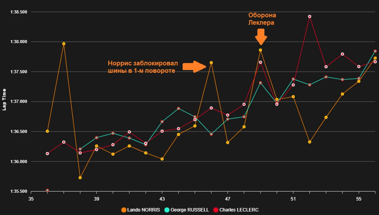 После того, как удалось разобраться с Льюисом, Ландо провел неудачную атаку на Леклера на 46-м круге и заблокировал шины: