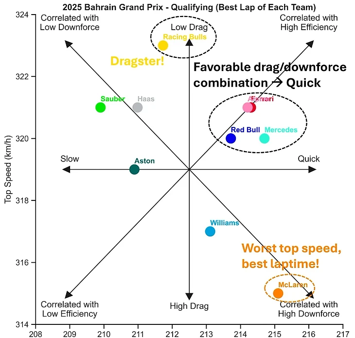 (ось вверх – максимальная скорость, ось вправо – средняя, правая верхняя четверть – самые эффективные машины по балансу прижима и скорости, нижняя правая – машины с наибольшей прижимной силой с меньшей потерей скорости).