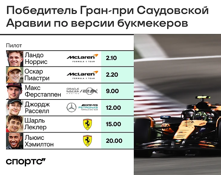 "Не до конца ясно насчет главного фаворита гонки. Норрис и Пиастри почти наравне – 2.10 против 2.20. Но Ландо регулярно испытывает трудности в Саудовской Аравии, а австралиец финишировал здесь выше него дважды подряд. Плюс, Пиастри сейчас в отличной форме, что нельзя сказать о Норрисе, склонному к излишней самокритичности.