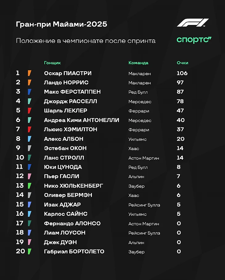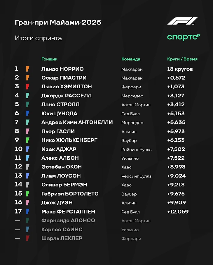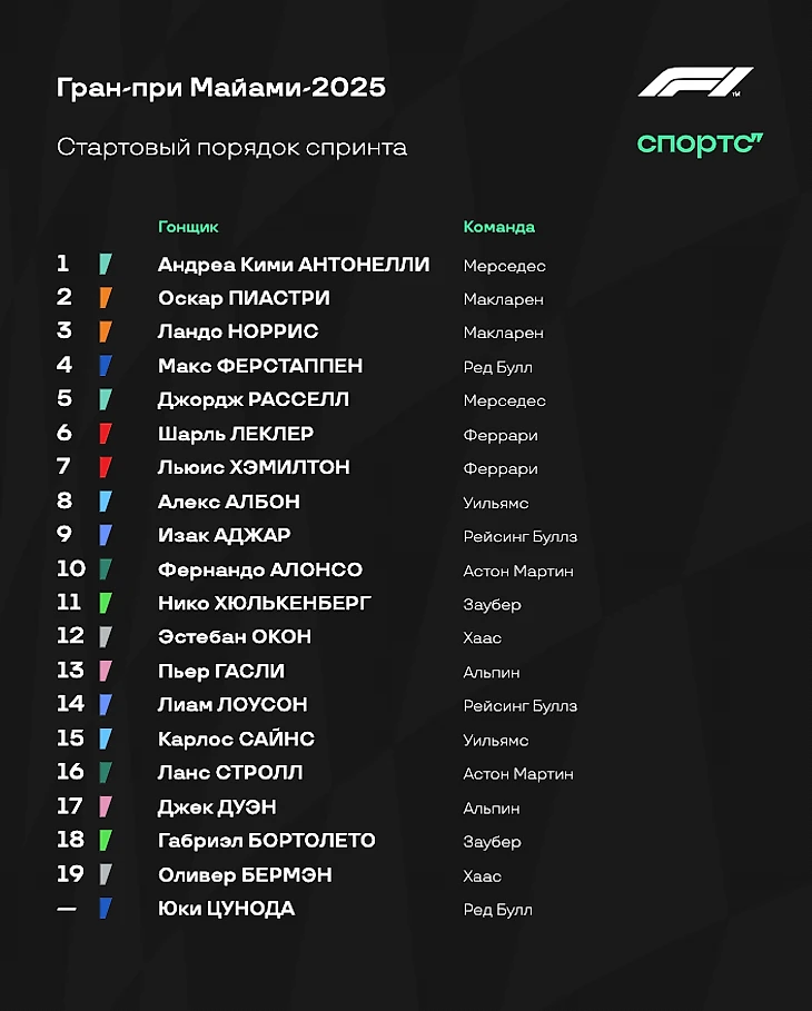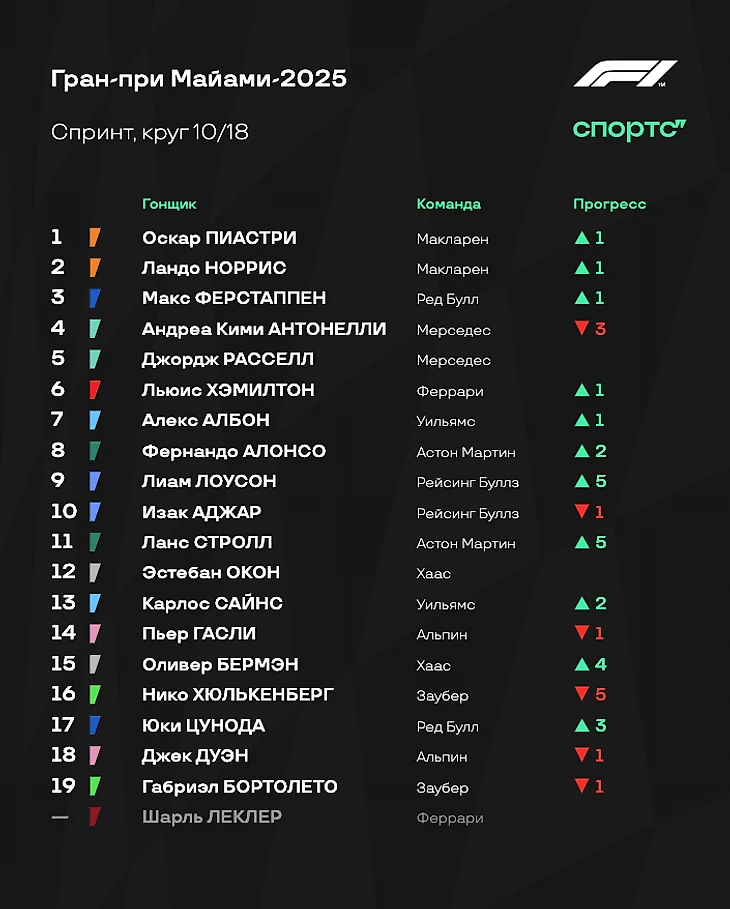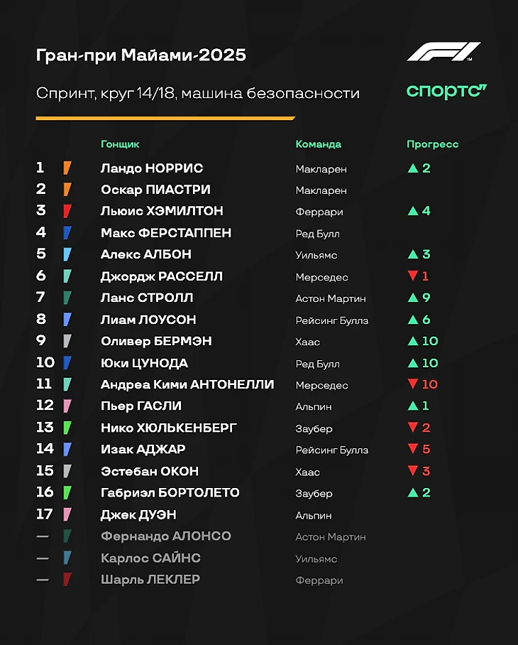Лоусон и Стролл начали спринт лучше всех: оба поднялись на пять позиций. Цунода обошел Дуэна и Бортолето. Антонелли посчитал, что Пиастри выдавил его в первом повороте.