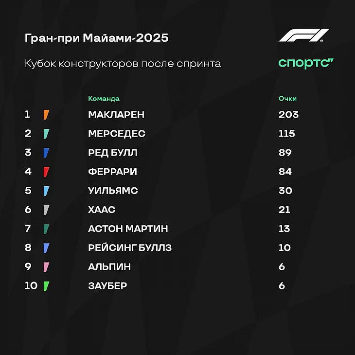 - «Макларены» провели отличный спринт, несмотря на хаотичные условия. Пиастри отправили в нужный момент за «софтом», а Норрису повезло остаться лидером в момент появления сэйфти-кара - когда большинство соперников уже побывало в боксах. Это позволило Ландо провести бесплатный пит-стоп, а дальше помогла авария Фернандо Алонсо - после которой весь оставшийся заезд прошел в режиме машины безопасности. - Антонелли впервые в карьере стартовал с первого места - и вышло жуть как неудачно. Старт он проиграл, провалившись на четвертое место. Темпа не было, а потом еще Ферстаппена неудачно выпустили на пит-лейн прямо в болид Кими. Пришлось еще раз заезжать на пит-стоп. Итоговое 10-е место выглядит печальным. Расселл же просто стабильно доехал пятым до финиша. - У «Феррари» все 50 на 50. С одной стороны, Леклер разложился еще до прогревочного круга, не справившись с дождевыми условиями. С другой, в случае Хэмилтона команда грамотно сработала, когда трасса подсохла. Вовремя совершенный пит-стоп позволил Льюису пробиться вверх и даже пройти Ферстаппена с поврежденным крылом. - Что касается «Ред Булл», то здесь все максимально неудачно. Цунода со стартом с пит-лейн, а позже с конца пелотона не рассматривался как претендент на хороший результат; Максу же команда сама запорола весь заезд ошибкой на пит-лейн. Ферстаппен получил за это 10-секундный штраф и опустился на последнее место по итогам спринта. Ужасная работа «быков». Им есть, над чем подумать. - Про остальных. Албон - четвертый. Жаль, что это только спринт, потому что результат мега крутой! И вдвойне обидно от того, что Алекс лишился его из-за штрафа. Его напарник Карлос Сайнс сошел чисто из-за собственной ошибки. Фернандо Алонсо вновь потерпел крах - ветерану жутко не везет в этом сезоне. Спринт оставил смешанные ощущения: вроде бы события яркие и хаотичные - но дистанция для такого экшена слишком короткая. Есть ощущения, что сама борьба на трассе длилась где-то половину спринта. Вторую половину мы наблюдали за машиной безопасности. Впереди основная квалификация, которая состоится в 23:15 по мск. Команды поменяют настройки - а значит, все начнется заново! Впереди много интриг.