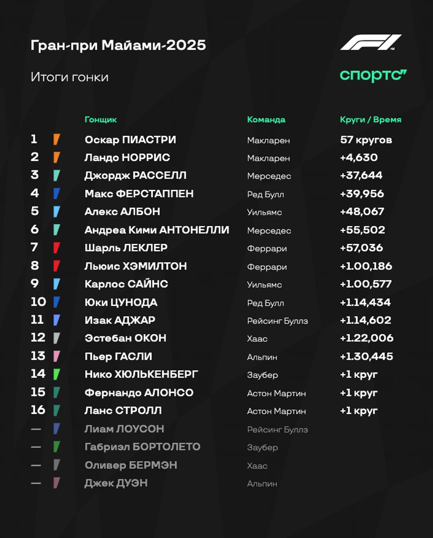● Тот же эффект нового мотора и везения помог и «Астон Мартин»: общий уровень машины остался прежним, но именно в Майами зеленая команда смогла воспользоваться ситуативными преимуществами.