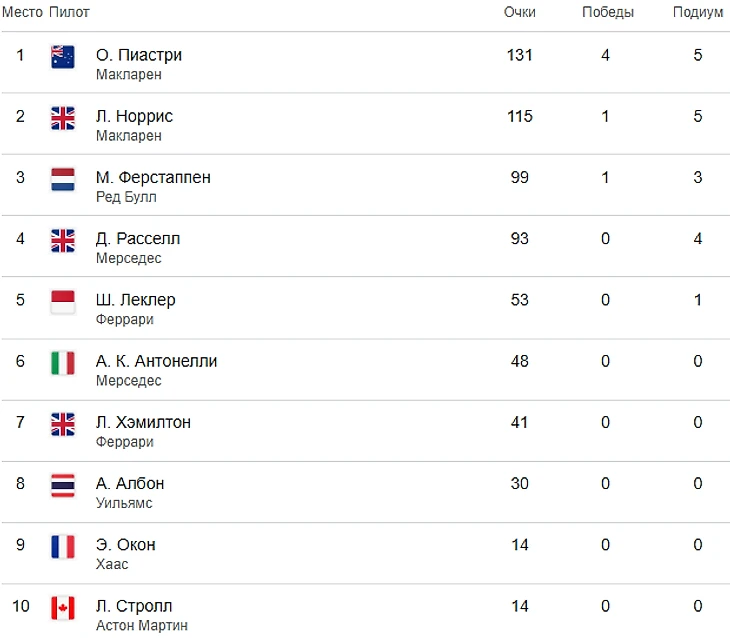 Изначально Ферстаппен удерживал лидерство – в то время как Норрис откатился назад, выехав широко во время ранней борьбы с голландцем, что позволило Антонелли и Пиастри опередить его. Вскоре Ферстаппен оказался под давлением со стороны Пиастри, что в итоге привело к обгону со стороны австралийца, а затем его примеру последовал и Норрис.