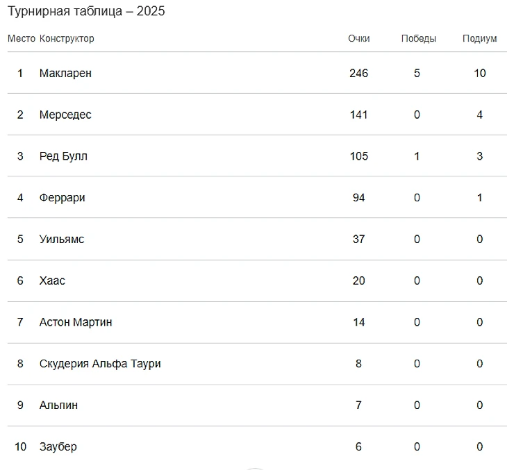 Кими Антонелли из «Мерседеса «(о нем позже) опередил обе «папайи» в пятничной квалификации к спринту, а Макс Ферстаппен также превзошел команду в субботней квалификации, на этот раз к воскресному Гран-при. Однако эти небольшие неудачи не помешали команде показать отличную скорость в гоночных условиях. Во время драматичного спринта, проходившего на подсыхающей трассе, Пиастри быстро вырвал лидерство у Антонелли в первом повороте и, казалось, шел к победе, пока в результате хаотичной концовки Ландо Норрис не перехватил лидерство, когда Пиастри заехал в боксы за сликами – как раз в тот момент, когда был выпущен автомобиль безопасности. Это позволило британцу совершить свой пит-стоп и сохранить первую позицию.