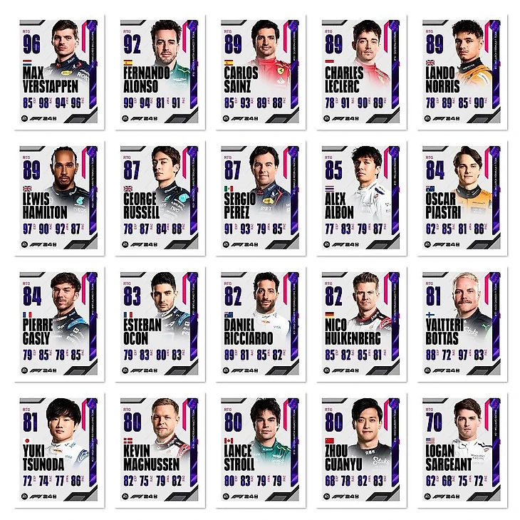 За несколько недель до релиза издатель опубликовал рейтинги всех пилотов главной серии. Самый высокий предсказуемо получил действующий чемпион мира Макс Ферстаппен – 95, а самый низкий − новичок «Рейсинг Буллз» Изак Аджар – 68.