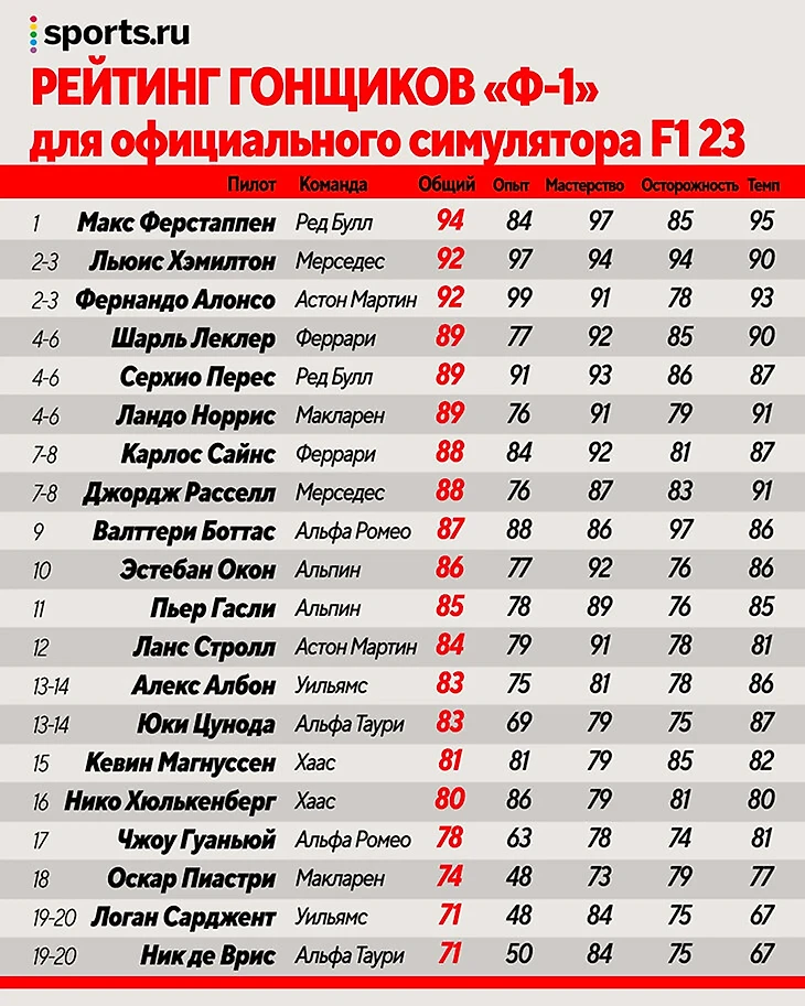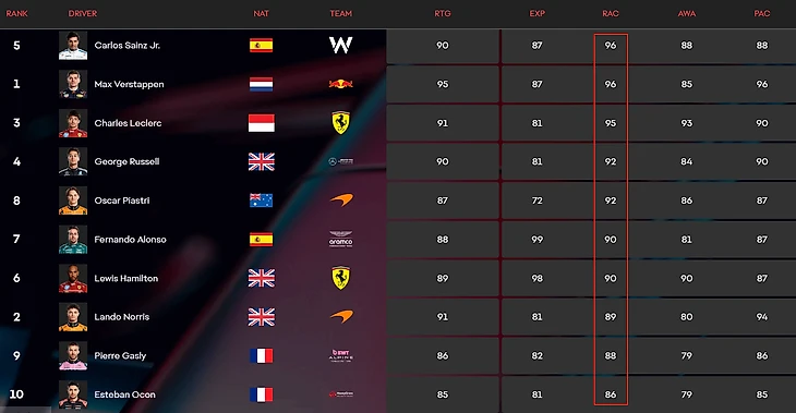 Гоночное мастерство позволяет в симе чаще обгонять и лучше защищаться в борьбе. Здесь лидером внезапно стал Сайнс (96), которого оценили наравне с четырехкратным чемпионом Ферстаппеном (96), а всего один балл им уступил Леклер (95).