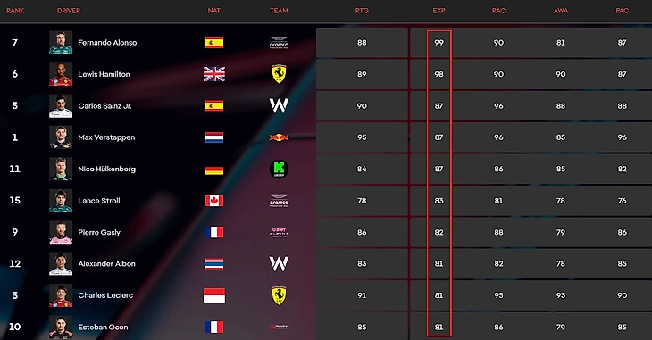 С опытом (EXP) все очевидно − наибольшие показатели у тех гонщиков, которые провели в «Ф-1» больше остальных гонок. Максимальный рейтинг здесь у Фернандо Алонсо и Льюиса Хэмилтона − по 99. Наименьший у четверки Габриэл Бортолето, Джек Дуэн, Андреа Кими Антонелли и Изак Аджар − 50-51.