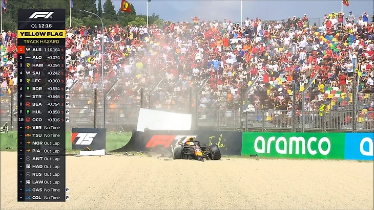 А вот «Уильямс» на трассе в Имоле пока не так быстр. Не очень хорошо их машине даются скоростные и узкие повороты с жесткими поребриками. Сайнс 9-й, а вот Албон вообще 13-й - у него была большая ошибка. Но будет еще одна попытка.