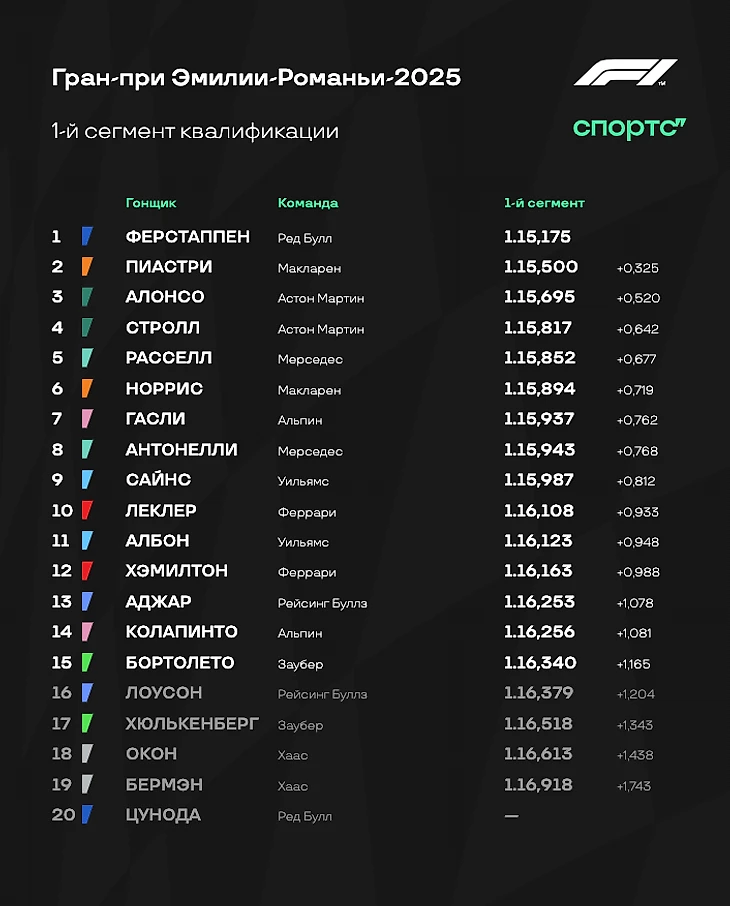 Удивительное окончание второго сегмента! Леклер и Хэмилтон выбывают! Антонелли вместе с ними! И все это благодаря прогрессу сначала «Уильямса», а потом и «Астон Мартин»! Алонсо и Стролл улучшили времена, причем сделали это на шинах «медиум»!