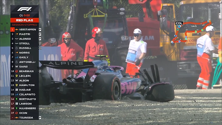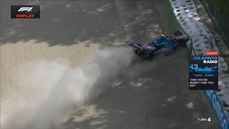 И еще один красный флаг! Еще одна авария - на этот раз «Альпин» разбил Франко Колапинто! Инцидент произошел на выходе из «Тамбурелло». Ох...