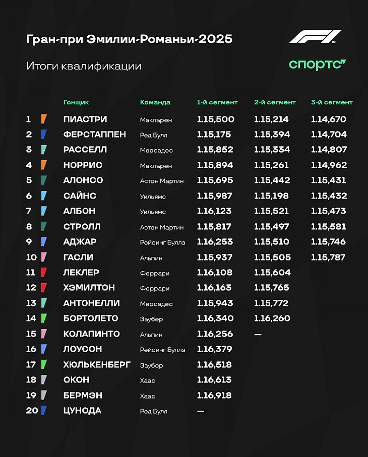 - «Макларен» казался очевидным фаворитом, но в итоге все вышло совсем не так однозначно. Не лучший круг Оскара Пиастри, но в итоге его хватило для поула. А вот Норрис провалился аж на 4-е место. Будет любопытно, сумеет ли он пройти Расселла и Ферстаппена.