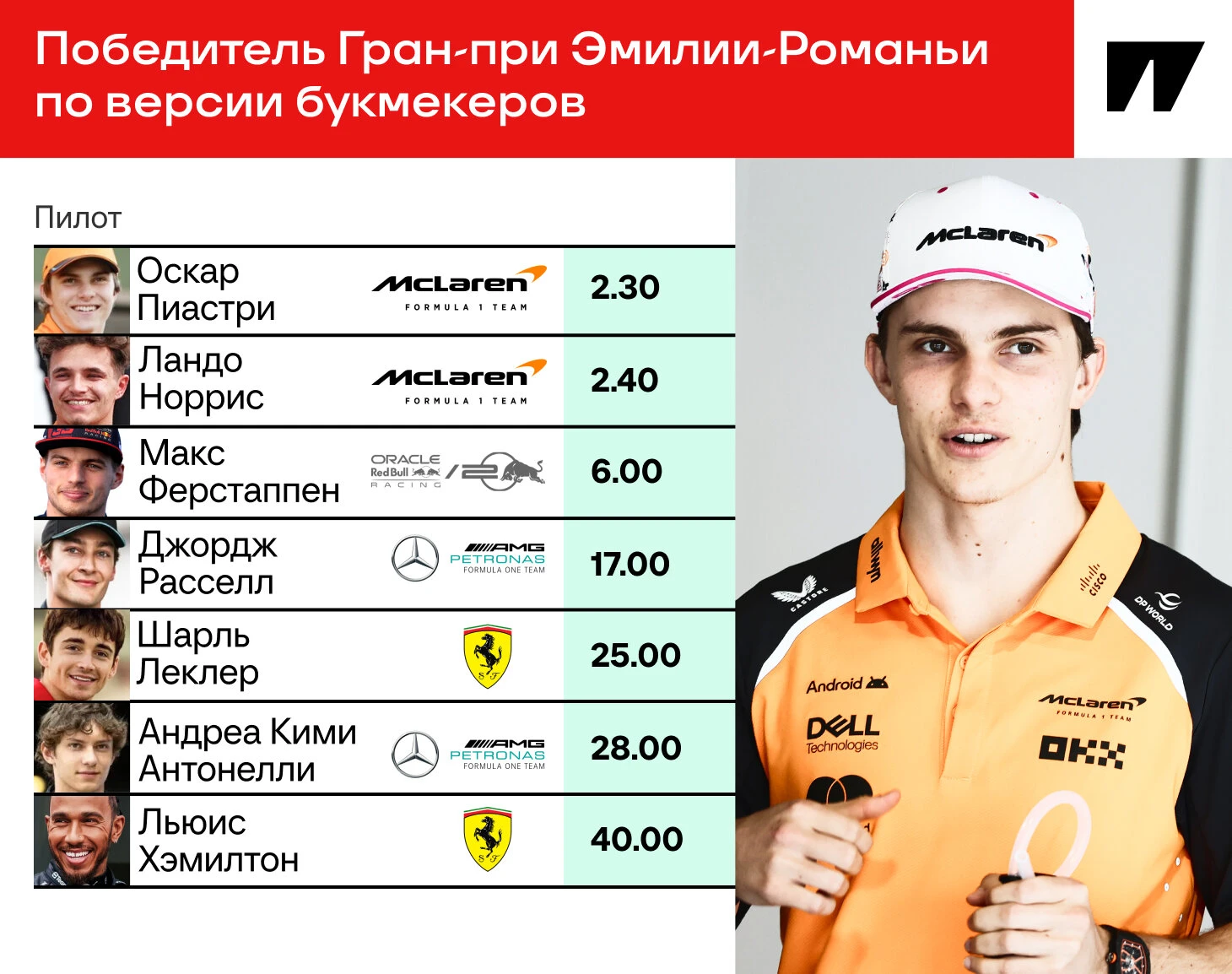 До Имолы в командном зачете видится крах интриги. До начала чемпионата букмекеры ожидали, что «Феррари» окажет достойное сопротивление тандему Норриса и Пиастри, но уже после шестого этапа коэффициент рухнул до смешного 1.01 на победу «Макларена».