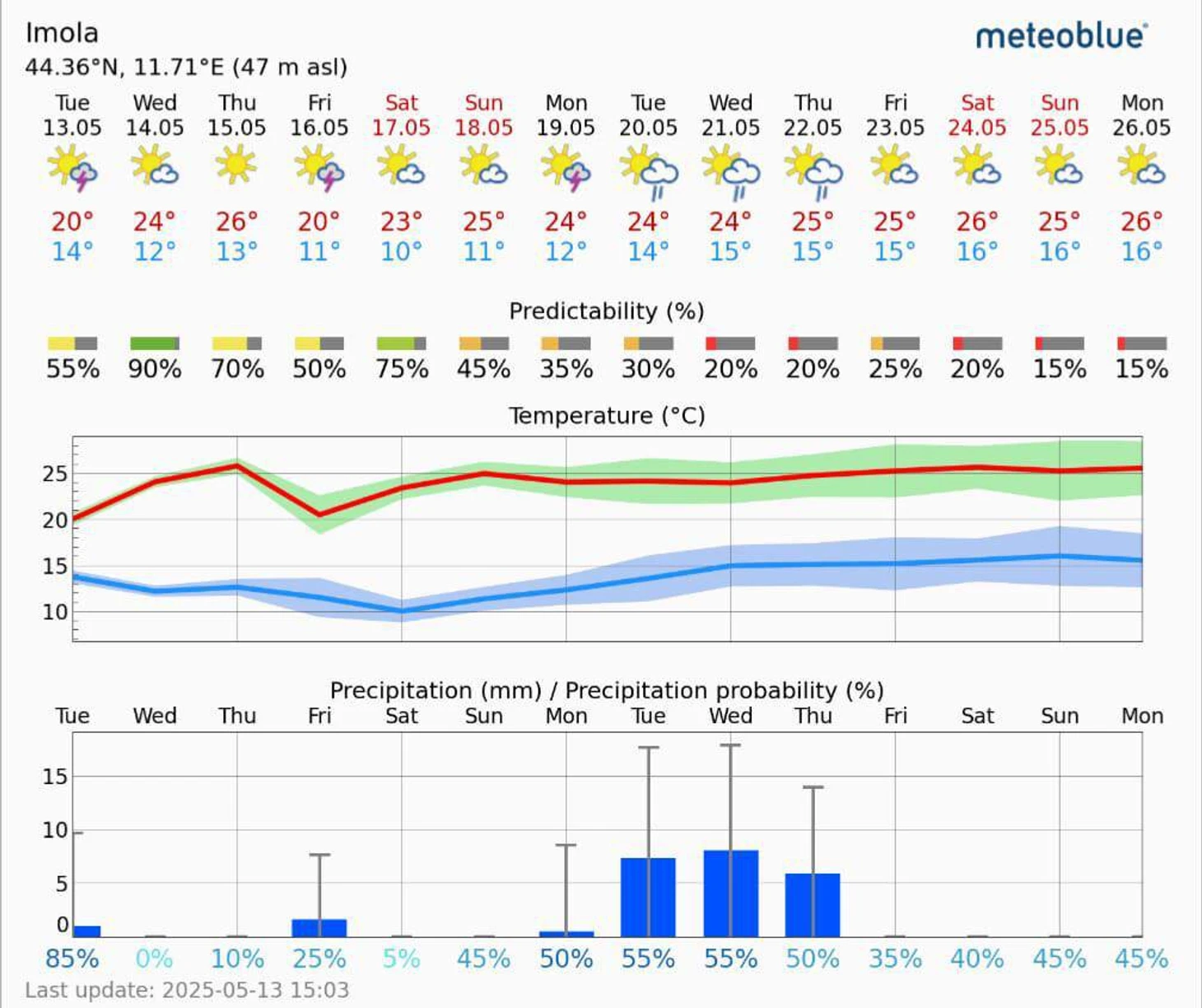 Еще один козырь из колоды «Макларена» уберет погода. Да, с пятницы по воскресенье в Имоле ожидается в основном солнце и ясные дни, но прогрев воздуха ожидается только до +22 по Цельсию – то есть жара не ожидается. А именно в жарких условиях «Макларен» сполна раскрывает преимущество по контролю за износом и перегревом покрышек относительно пелотона – в Имоле все окажутся ближе. Причем именно на гонку с течением недели появляется все больше прогнозов с вероятностью небольшого дождя – в районе 45%.