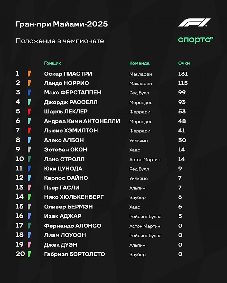 После шести этапов австралиец оформил уже четыре победы в больших гонках (три подряд), но запас над Ландо Норрисом составляет только 16 очков.