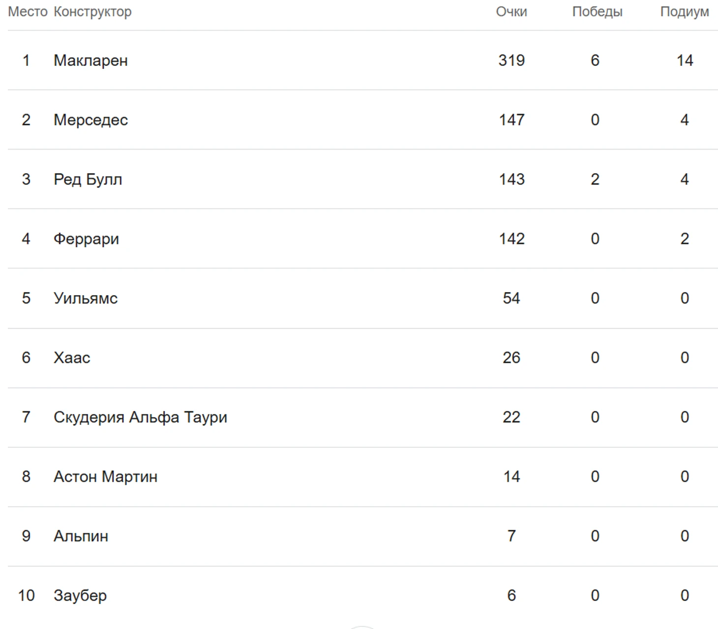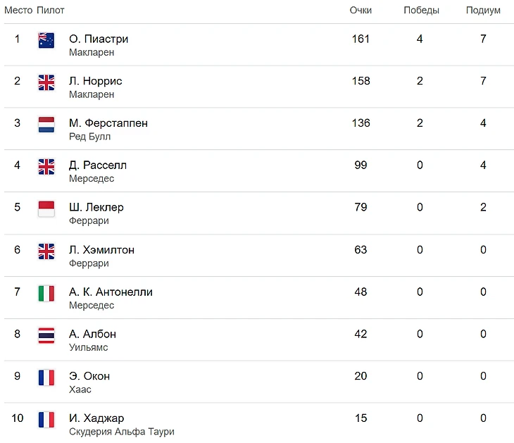Третьим финишировал Оскар Пиастри на втором «Макларене». Австралиец отстоял лидерство в чемпионате после очередного подиума. Однако отрыв от Норриса теперь составляет всего три очка. «Результат вполне неплохой. Победа, конечно, была бы лучше, но здесь мне не очень повезло. Я сделаю всё возможное, чтобы победить здесь в следующем году».