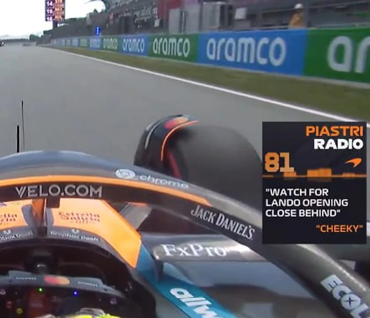В третьем сегменте Ландо разогнался за счет слипстрима от Оскара, поставив лучшее время. Комментарии Оскара всегда вызывают улыбку: