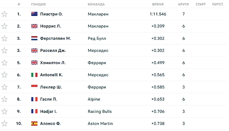 В итоге Пиастри с лучшим временем уикенда — 1:12:387, за ним Норрис — 0.526 и Леклер — 0.743.