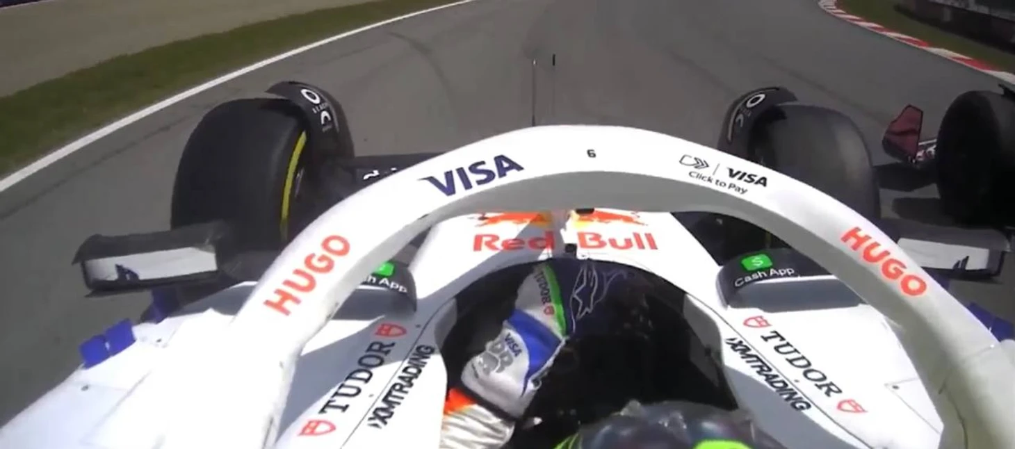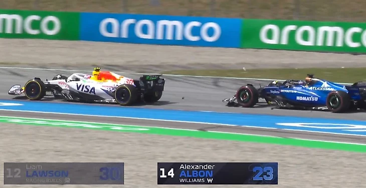Не дожидаясь решения стюардов, Лиам агрессивно обходит Албона с внутренней стороны, повреждая ему крыло: