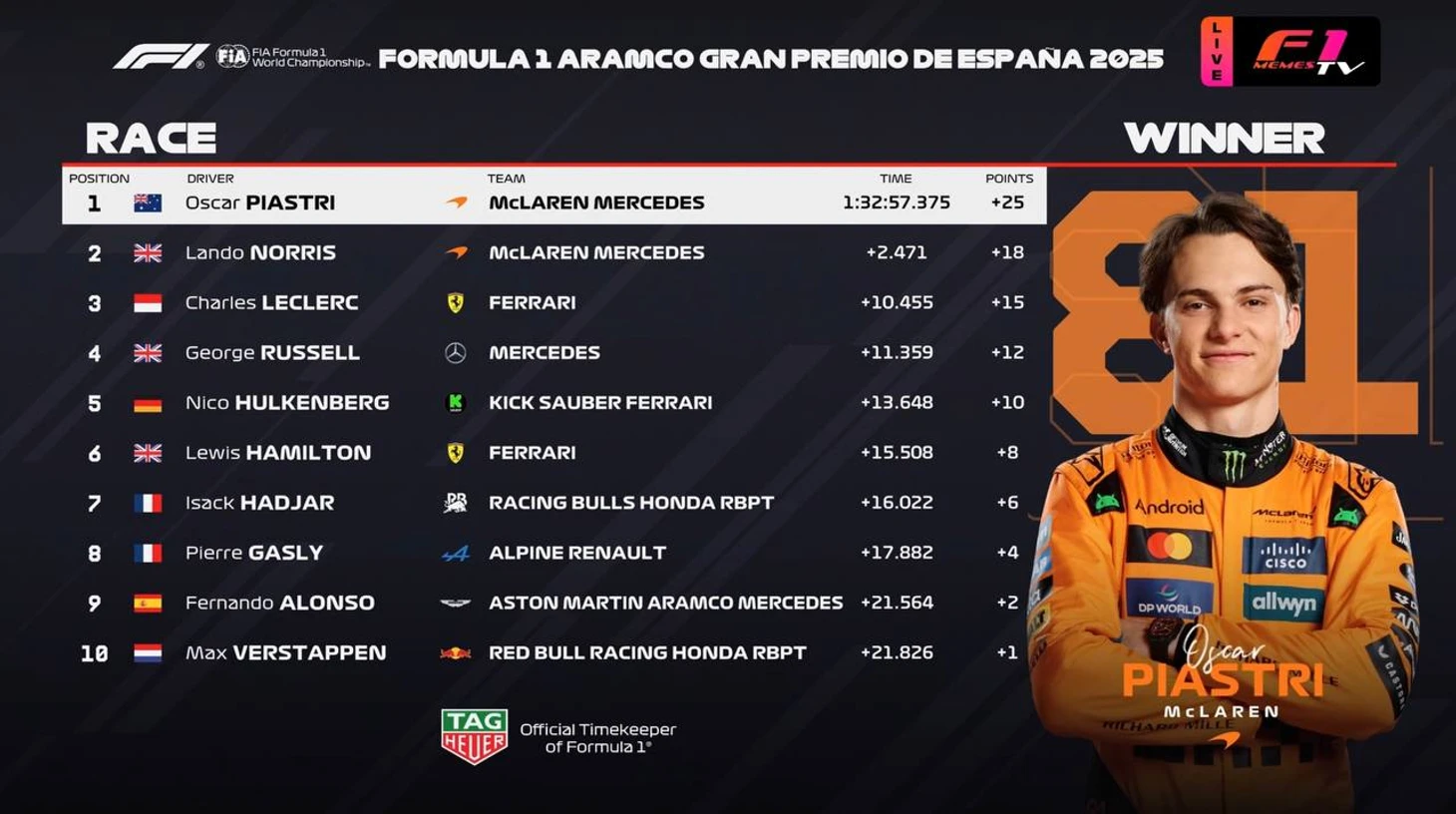 Оскар выигрывает эту гонку, второе место занимает Ландо, а третье — Леклер, таким образом двигая Феррари на второе место в кубке конструкторов.