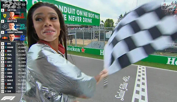 На Гран-при Канады 2018 года, когда клетчатый флаг был один, его доверили модели Винни Харлоу. По ошибке она махнула им на 69-м круге вместо 70-го, что сократило дистанцию на два круга. Это произошло из-за неверной коммуникации между организаторами и официальным стартером, который в свою очередь дал девушке неправильную команду.