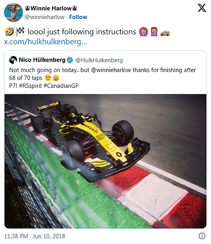 Тогда еще пилот «Рено» Нико Хюлькенберг пошутил, что сегодня не произошло ничего интересно, а затем поблагодарил модель за финиш на несколько кругов раньше. Девушка ответила, что она следовала инструкциям.