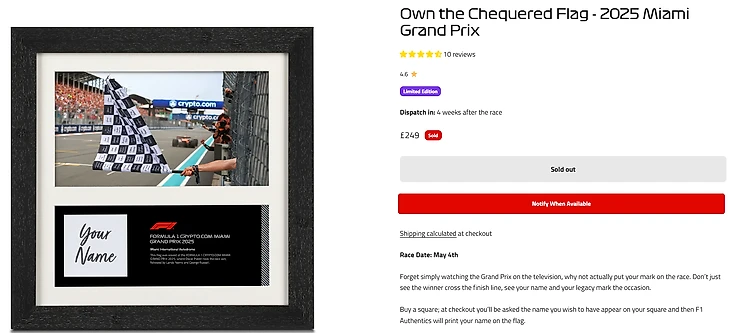 Сколько это может стоит? Фрагмент флага с Гран-при Майами продавали за 249 фунтов, такая же цена для Мексики, Австрии, Абу-Даби и Сан-Паулу. А вот Бельгия и США – 349 фунтов, тогда как Италия (Монца) – 399 фунтов. Рекордсмен – Гран-при Великобритании, а также гонка в Лас-Вегасе – 549 фунтов!