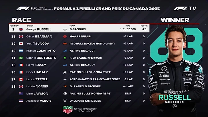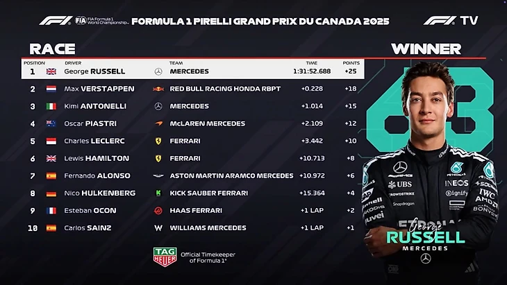 1:14:119 — самый быстрый круг гонки, забирает его Рассел вместе с поулом, Ферстаппен финиширует вторым.