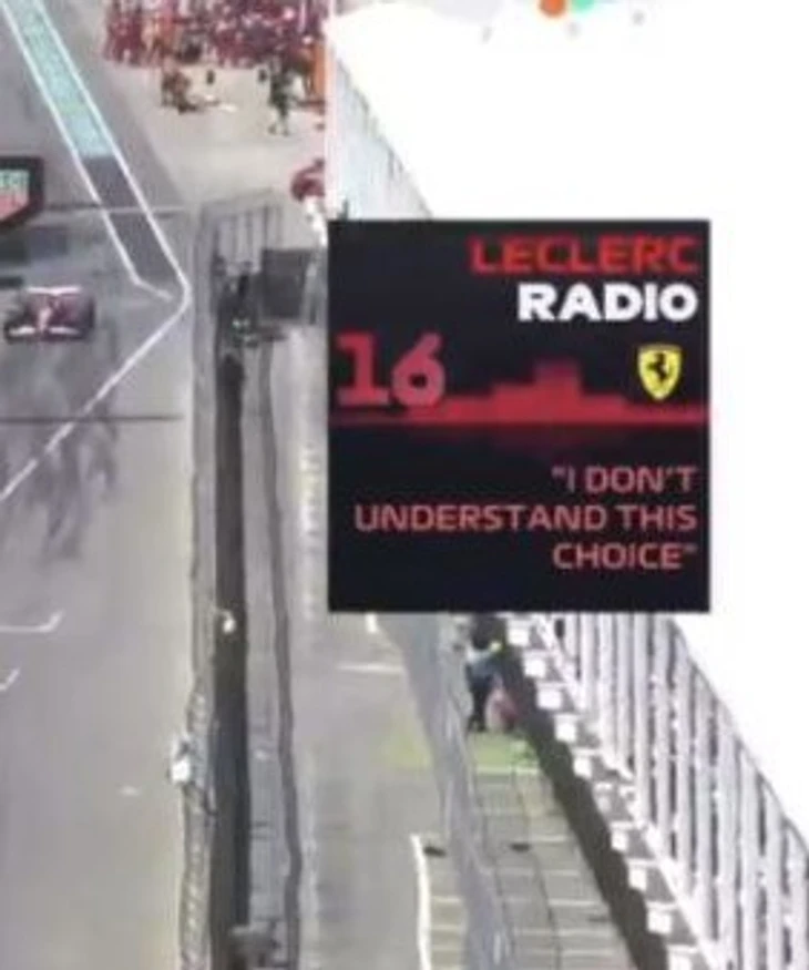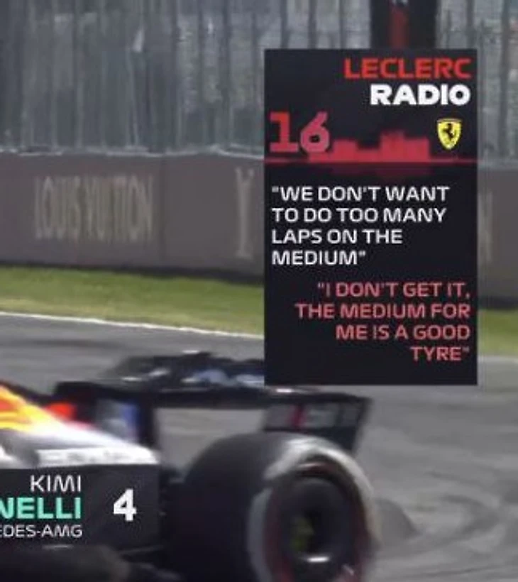 * Леклер не понимает, почему команда не хочет переобуть его в мидиум, ведь темп падает, а на легкой машине мидиум бы отлично зашел. Потому что это Феррари, малыш.
