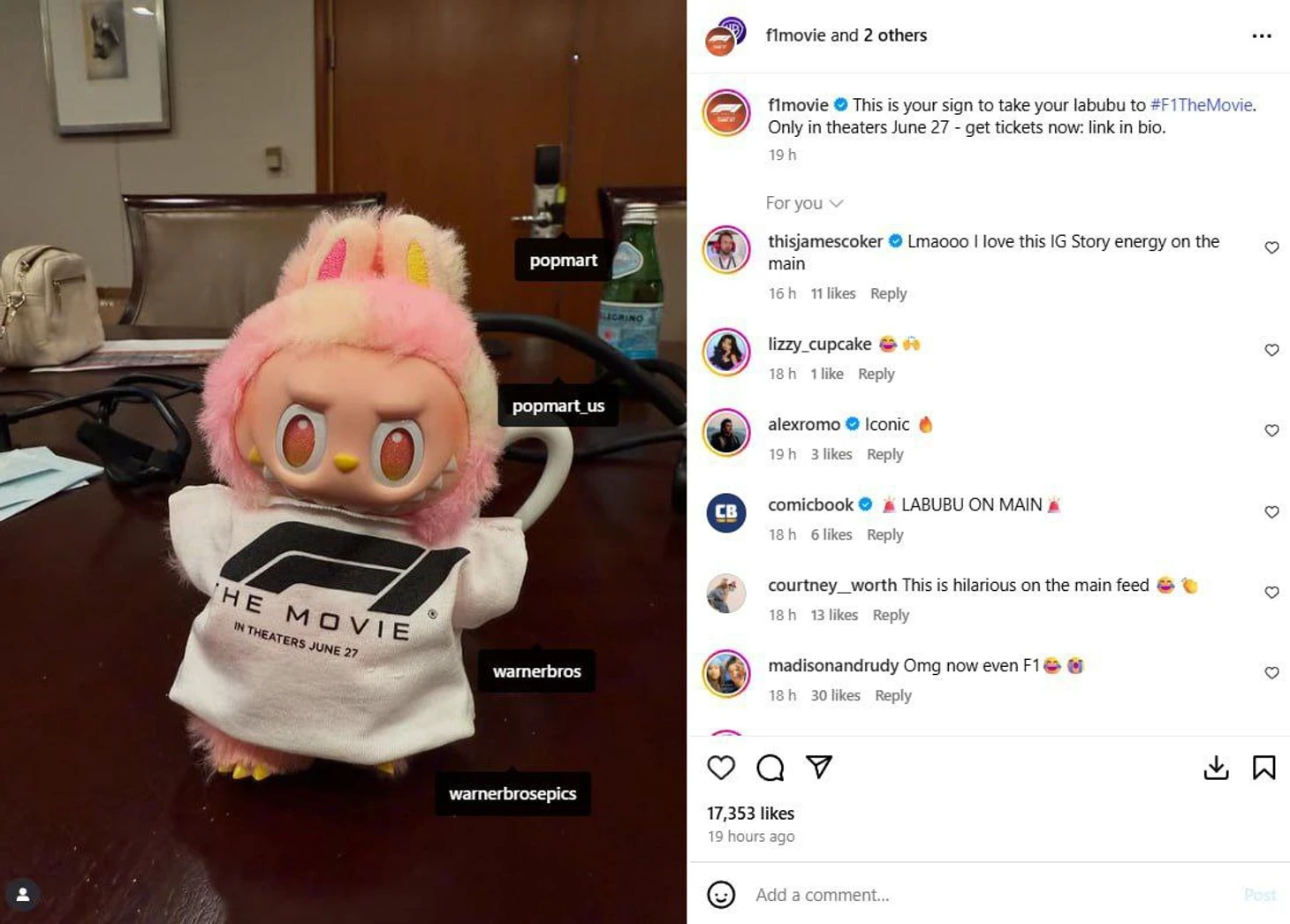 До премьеры соцсети завалили контентом, также помогало сотрудничество с самой серией, командами (например, с «Маклареном») и некоторыми гонщиками. Кроме этого заход через такие хайповые вещи, как лабубу, тоже ломает алгоритмы и помогает продвижению фильма.